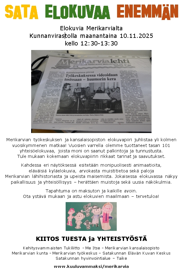 Kehitysvammaisten Tukiliitto - Me Itse - Merikarvian kansalaisopisto - Merikarvian kunta - Merikarvian työkeskus – Satakunnan Elävän Kuvan Keskus Satakunnan hyvinvointialue – Taike