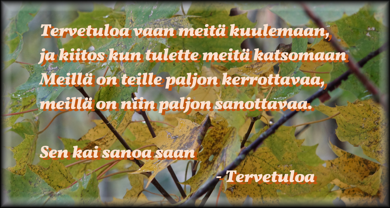 Tervetuloa nauttimaan syksyn hyvistä tunnelmista, jotka tuovat ruskan värin sydämiin ja saa ajatukset leijumaan kuin vaahteranlehdet tuulessa.